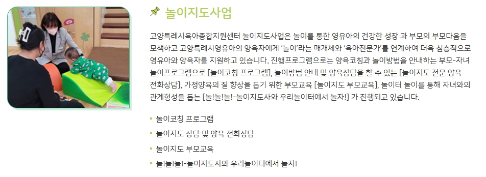 고양특례시육아종합지원센터는 이처럼 다양한 프로그램을 통해 지역 사회의 보육 환경을 개선하고, 부모와 자녀가 함께 행복한 생활을 할 수 있도록 돕고 있습니다.