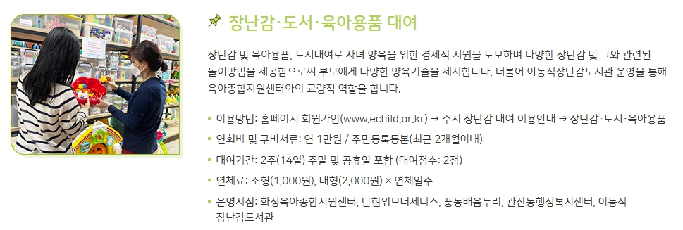 센터는 자녀 양육에 필요한 장난감, 도서, 육아용품을 대여하는 서비스를 제공합니다. 이를 통해 경제적 부담을 줄이고, 부모가 자녀에게 제공할 수 있는 다양한 놀이 자원과 양육 기술을 제시합니다.